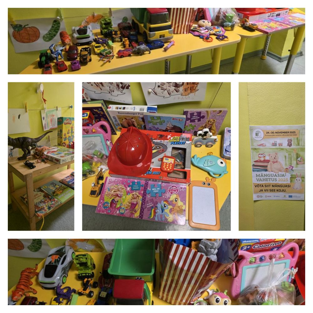 Kuni neljapäevani kogusime lasteaias kasutatud, kuid heas korras mänguasju. Seejärel seadsime koridori esikusse näituse juurde üles lauad, kuhu paigutasime kõik uut kodu ootavad mänguasjad. Õhtul, kui vanemad tulid oma lapsele järele, said nad valida ühe mänguasja, mis endale pere leiaks.
