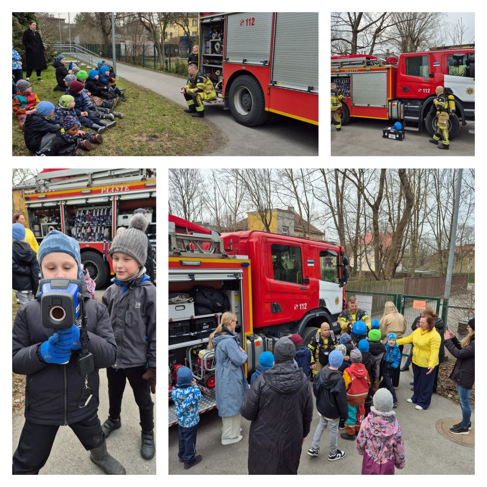 Alustasime saalis vestlusringis, kus päästjad rääkisid olulistel teemadel, mida lapsed peaksid teadma, kui tekib tulekahju. Vahepeal tekkis olukord, kus päästjad pididki väljakutsele sõitma ning meie kohtumine jätkus õues mõni aeg hiljem. Põnevust lastel jätkus. Näha sai auto päästmiseks valmis sisu ja selle kasutamist, pähe prooviti päästja kiivrit, prooviti veevoliku raskust ja selle kokku korjamist, piiluti läbi udukaamera, kuulati, kuidas suitsuandur töötab ja vastati olulistele küsimustele.